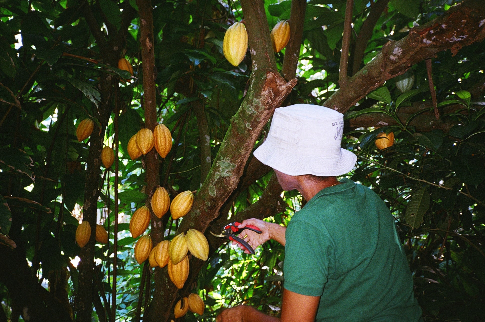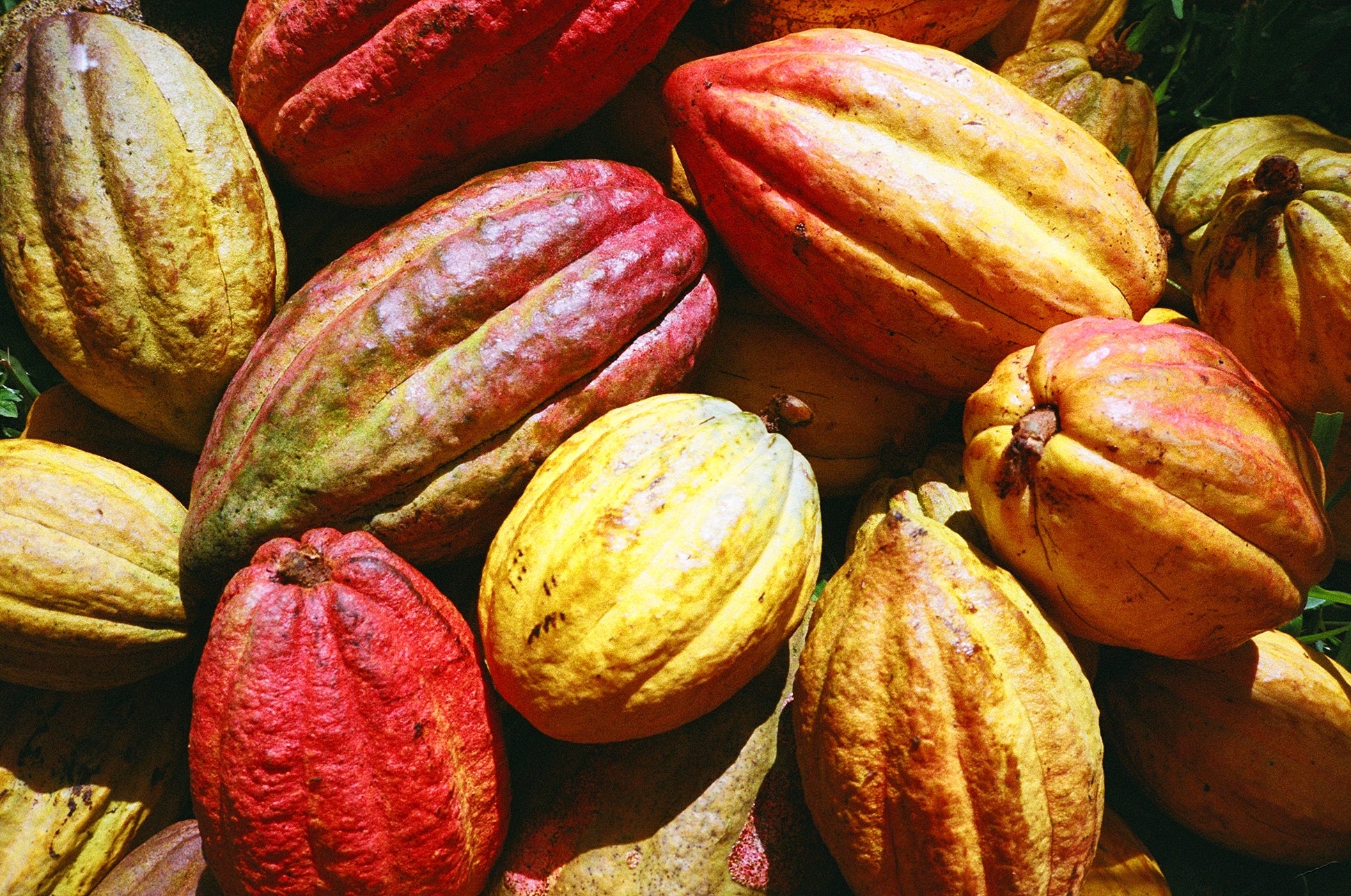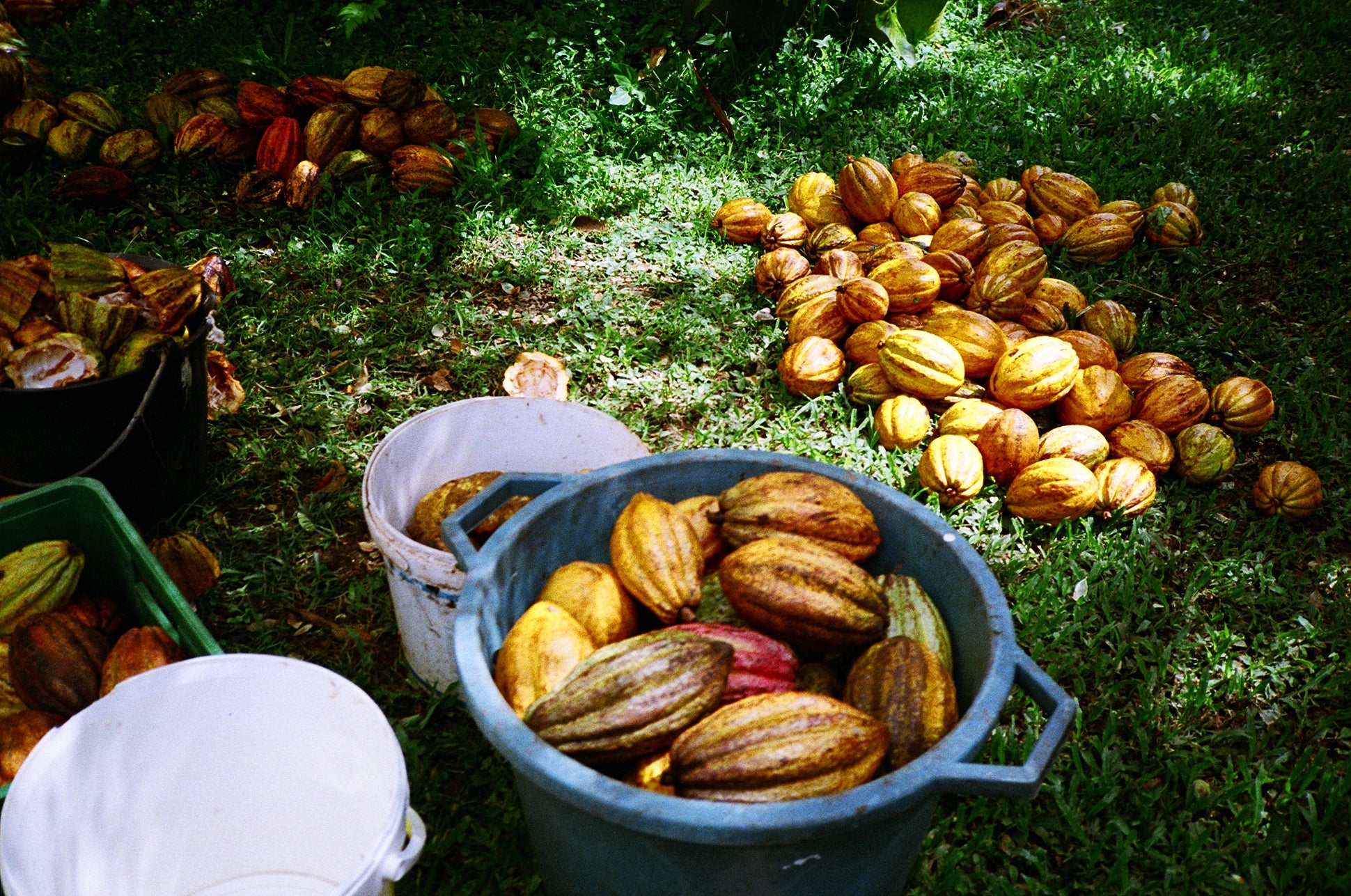 Pod colour is only a rough guide to bean ripeness. Farmers rely on experience to assess when perfect ripeness has been reached. A task not made easier by the fact that pods on the same tree do not always ripen evenly. Once harvested the pods are split open with jungle knives and carried in bags to the fermentation boxes.